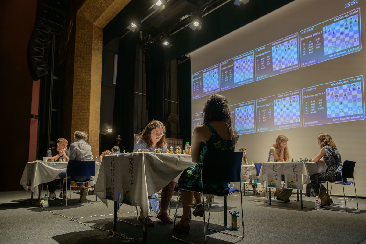 8/20/2025 – The French Chess Championships are being held in Vichy from 15 to 24 August as part of a large chess festival featuring events for all levels, from national title matches to youth and amateur competitions. The Open and Women's Championships, organised as 16-player knockouts, have now reached the semifinals. In the Open, three veterans join 18-year-old Marc'Andria Maurizzi, while in the Women's, recent champions face ambitious challengers for a place in the final. | Photos: Nathalie Daubry / French Chess Federation