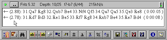 As usual in this tournament Allwermann has outplayed his opponent and is easily winning. Fritz 5.32, which reproduces all the moves so far, now shows an evaluation of 4.06 in favour of Black and expects the continuation 34...Bh2 35.f3 Bxg1 36.fxe4 Rxc3 37.Nc2 Bxd4 38.Rc1 Qa5 39.Nxd4–+.