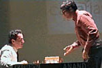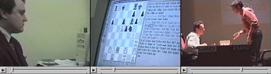 Yury Dokhoian checking the 20.g4 line with Fritz in real time during the game, Kasparov and Anand analyse after six hours of play [video grabs from the CBM 56 multimedia report].