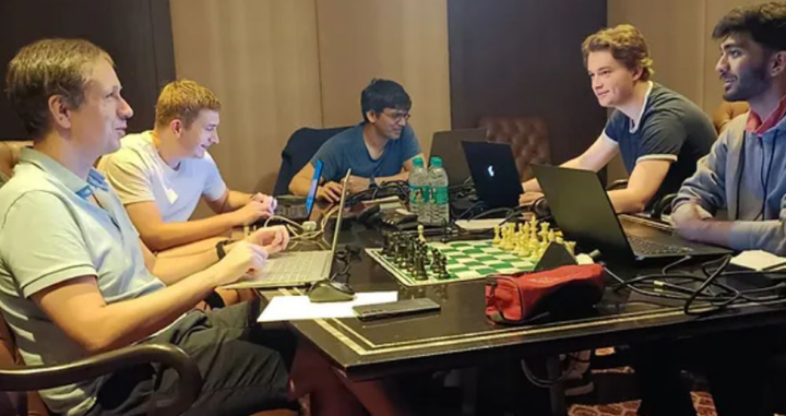 The seconds who 'polish'ed 2024 Gukesh's game: Radek Wojtaszek, his compatriot and good friend Grzegorz Gajewski (the chief second of Gukesh), in the middle Pentala Harikrishna from India, German Vincent Keymer, and Gukesh D. | Photo: Gukesh's Instagram