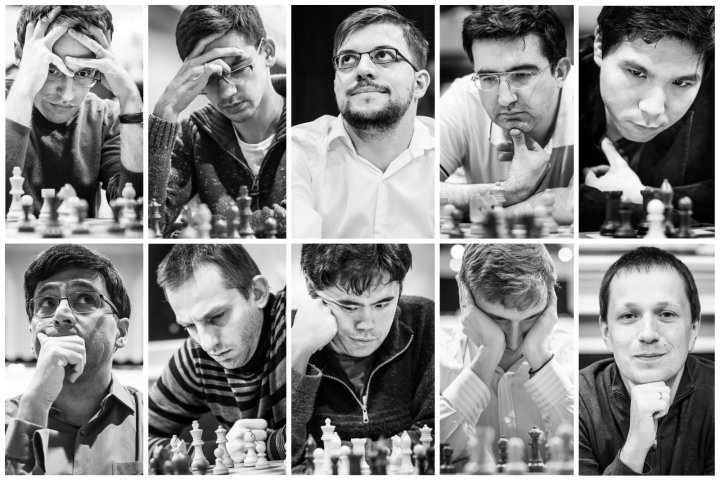 What an incredible line-up! The ten highest entries at the IoM 2018. In fact, six players from the Top Ten FIDE Elo rating list of October 2018, namely Aronian, Giri, MVL, Kramnik, So, and Anand, followed by Grischuk, Nakamura, then no. 13 of the world, Karjakin, winner Wojtaszek, seeded as no. 10. | Photo Collage: Alina L'Ami