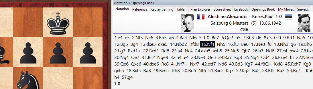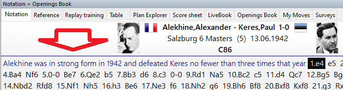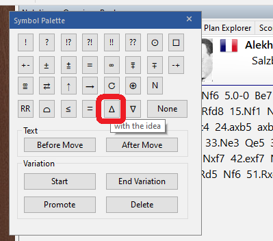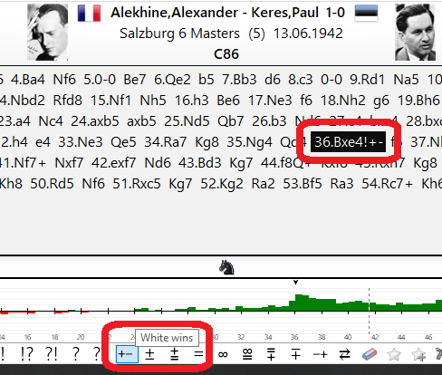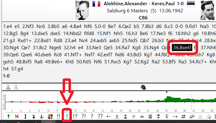 For example, here I added an exclamation point to the 36th move by Alekhine against Keres by clicking on the '!' in the toolbar.