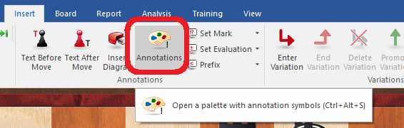 At the bottom of the notation is a detailed toolbar with all the most used marks. Just click on one and it will be appended to the move.