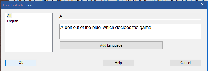 Adding a text comment to a move is as simple double-clicking on it. You can specify a language so that you can add comments in several and choose which ones you want to use, or just stick in 'All'.