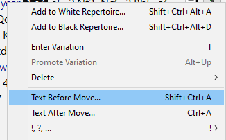 You might also wish to add text before a move. This is useful if you want to add a comment before a new line of thought, or at the start of a game as an introduction.