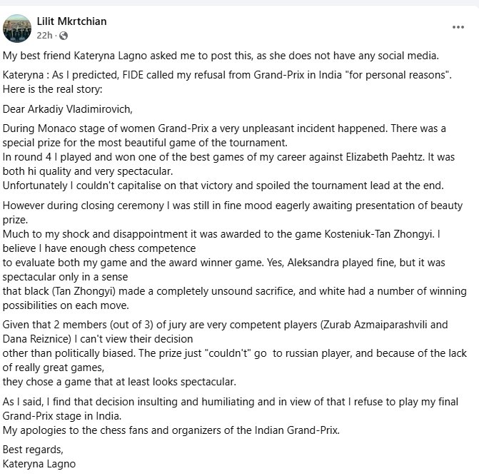 The Ukrainian-born Russian grandmaster Kateryna Lagno has decided not to participate in the next leg of the Women's Grand Prix in India. The FIDE statement simply mentions that Lagno has withdrawn for personal reasons. However, the player has now contradicted this in a public statement, which Peter Heine Nielsen shared on X, formerly Twitter.