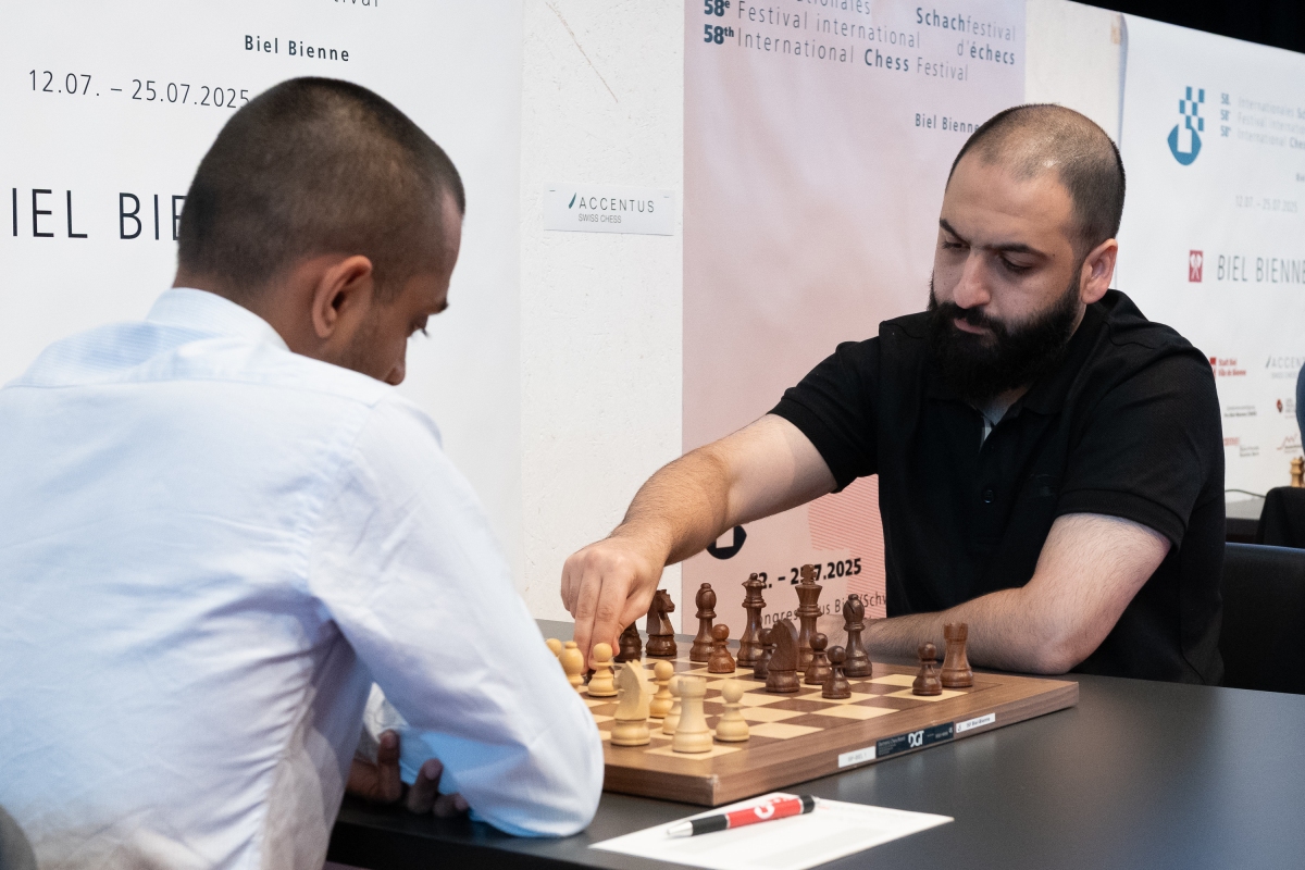 After today's ten games of blitz, Saleh Salem and Vladimir Fedoseev are leading the Biel GMT-Masters. Fedoseev in particular put in a strong performance in the fastest cadence of the triathlon, scoring 7 ½ out of a possible 10 points. He thus equalled Salem on points, who also underlined his good form by winning 6 points. Aravindh, who achieved the same score as Salem today, is the first runner-up, 1½ points behind.