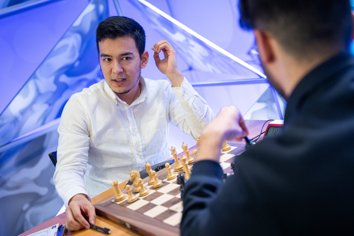 8/27/2025 – In the penultimate round of the Sinquefield Cup, Nodirbek Abdusattorov finally found success after a difficult event, defeating Alireza Firouzja to claim his first win. The result confirmed Firouzja's elimination from the Grand Chess Tour Finals race, ending his hopes after two consecutive losses. Elsewhere, Fabiano Caruana and Praggnanandhaa Rameshbabu both drew and remain joint leaders on 5 points, while Levon Aronian and Wesley So trail just half a point behind heading into the final day. | Photo: Lennart Ootes