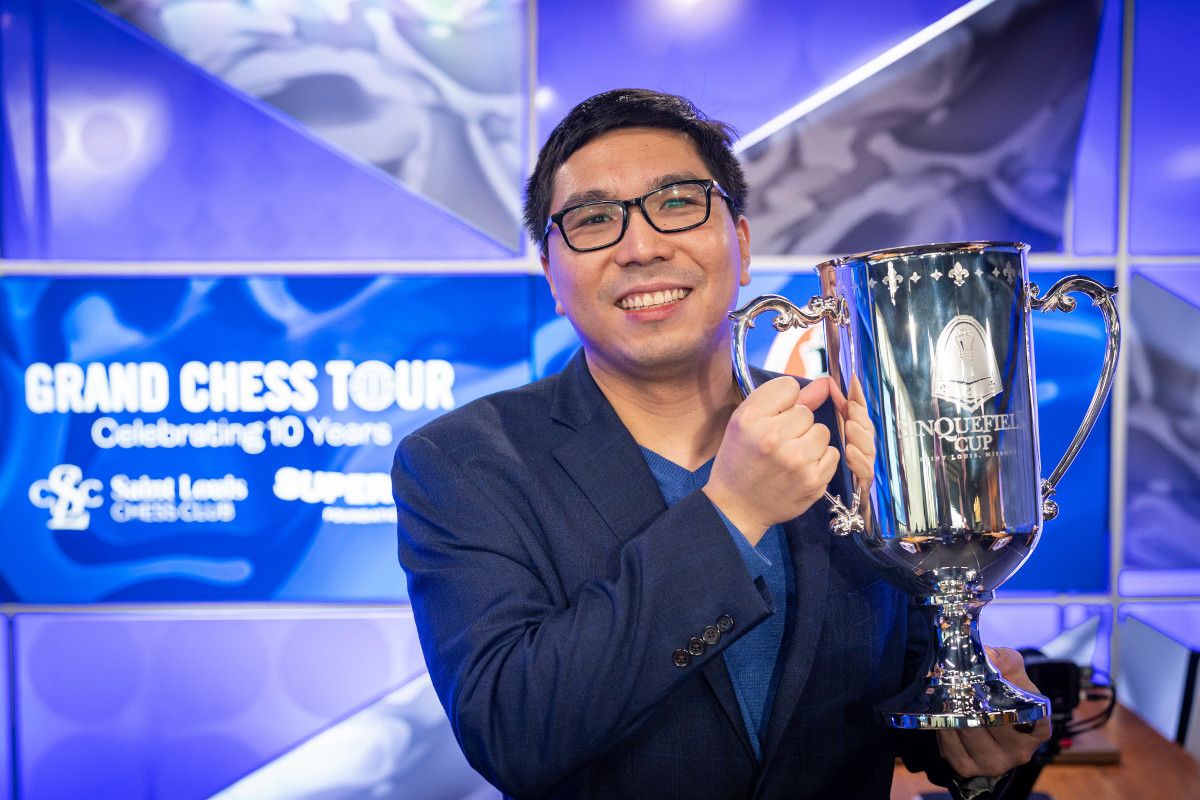 8/28/2025 – Wesley So left his best until last at the Sinquefield Cup, turning a quiet start into a tournament victory on the final day in Saint Louis. After outplaying Nodirbek Abdusattorov in round nine, he joined Fabiano Caruana and Praggnanandhaa Rameshbabu in a three-way tie for first. A tense blitz playoff followed, where So defeated Pragg and then held Caruana to a draw, enough to secure the title - even if it was not quite enough to reach the Grand Chess Tour Finals. | Photo: Lennart Ootes