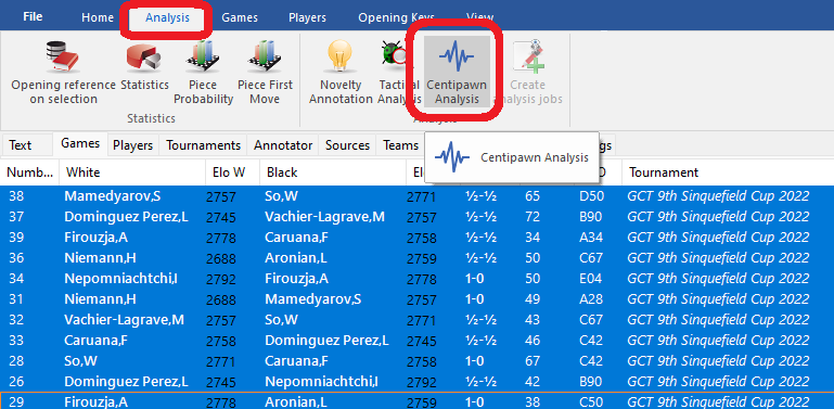 First we open up a list of all the games of the tournament, then highlight the same you want analyzed.