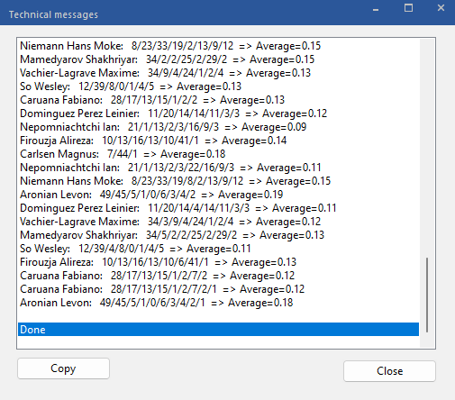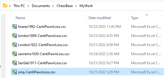Important: Be warned it will create the Excel file named after the database you did the analysis on, so if you were to run the centipawn analysis on a subset of games of Mega 2022 for example, then each time you ran the centipawn analysis, it would overwrite the previous Excel file with the same name.