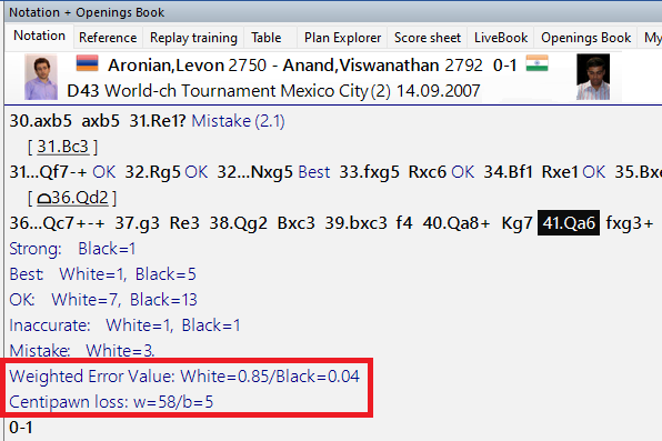 It tells us that Vishy's play was near flawless and his average error rate was exceptionally low. What is the Weighted Error Value compared to the Centipawn Analysis seen in the image above? ChessBase has an algorithm that highlights moves of greater value, and moves of lower value. Suppose there was a sequence of forced recaptures. These might be played 'flawlessly', but they were not really representative of a higher standard of play. In the Weighted Error Value those moves are ignored. There are other factors, but the point is the Weighted Error Value takes other things into consideration when giving its final verdict.