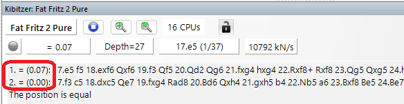 Assuming no other engine disagrees with this ranking, Let's Check will report this as a miss since it does not match an engine's top choice. In contrast Centipawn Analysis won't care about the overall ranking of the move, and only the difference in evaluation, which in this case is 0.07 centipawns.