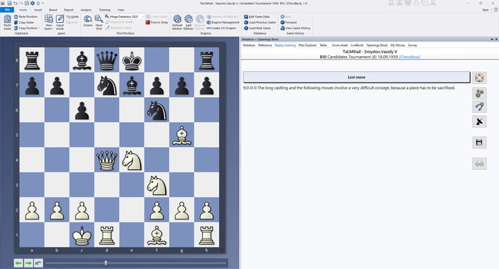 As in the last two tutorial articles on awarding medals and getting started with replay training, we open the game Tal vs. Smyslov from the 1959 Candidates Tournament for illustration purposes. You can watch the entire game in the replayer: