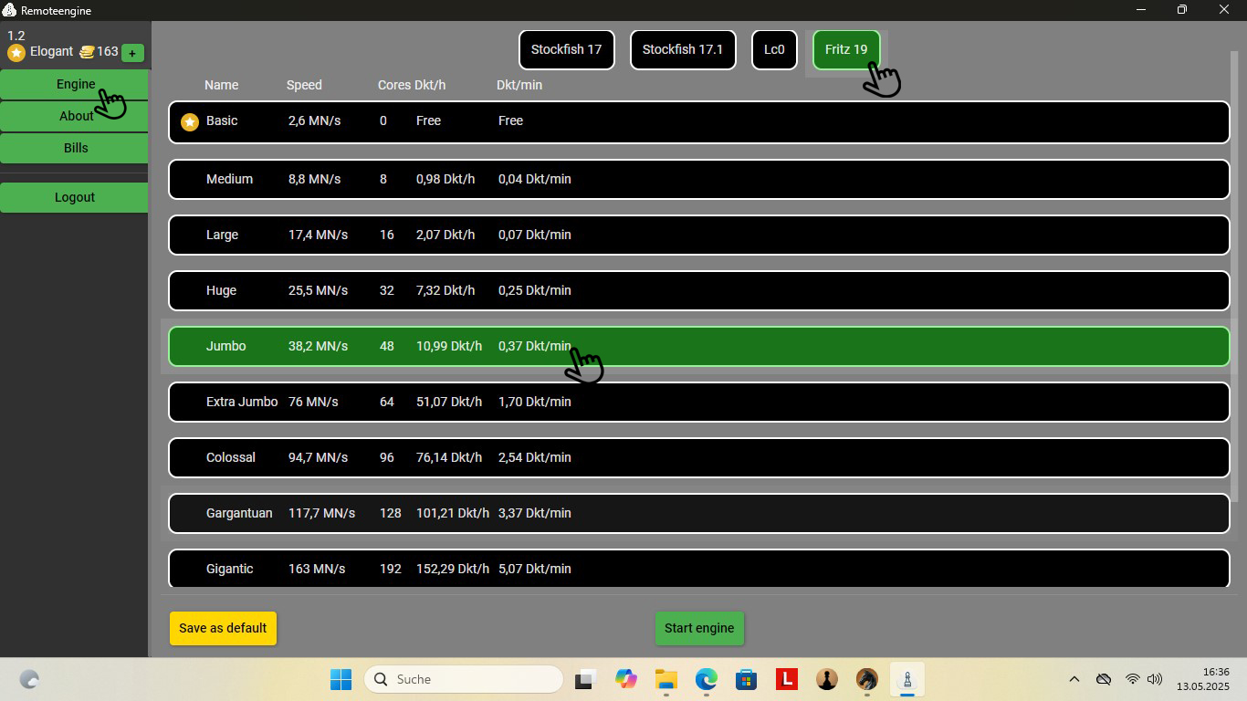 If this is too cheap or too expensive for you, simply select another engine. Incidentally, Lc0 is now also available here, an engine that won against Nakamura in blitz, even though it gave the top human opponent a knight!