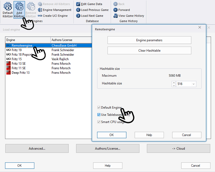 At the end of the second part of this tutorial, we showed you how to add an engine. In the same "Add a Kibitzer" menu, you will see "Remoteengine" next to the engines installed on your computer. You can simply click on this or set it as the "Default Engine" by right-clicking on the selected engine and checking the box next to "Default engine" in the "Properties" menu that opens.