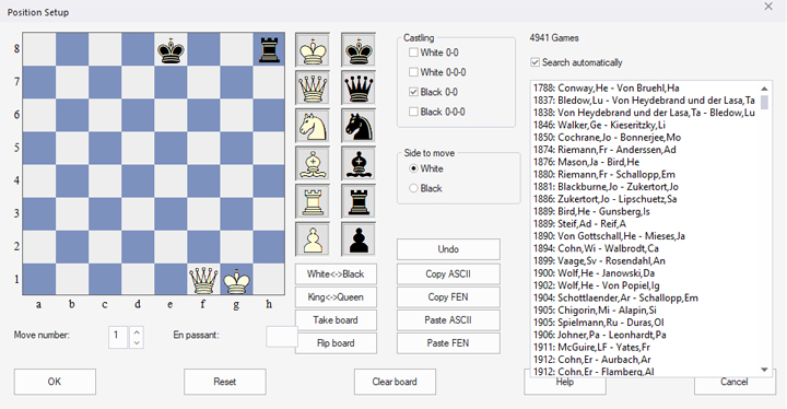 - The "Castling" field indicates that Black can still castle (provided that this is permitted in the current position). If this is no longer permitted because the king or rook has already been moved, you can remove the check mark.