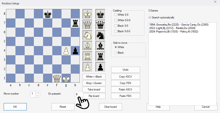 - In addition to the castling function already explained, there is also a setting option for en passant capture. In the position above, the white pawn on g4 has been added to the previous position and there are still three games in the database. If Black is to move, as set, you cannot know without knowing the course of the game whether the capture ...h4xg3 e.p. is legal in this position. Of course, it would only be legal if g2-g4 had been played immediately before. If you want to include this possibility, enter the line on which such a capture would be allowed in the "En Passant" field – logically, there is only one such possibility in each position, since White can only have moved one pawn last.