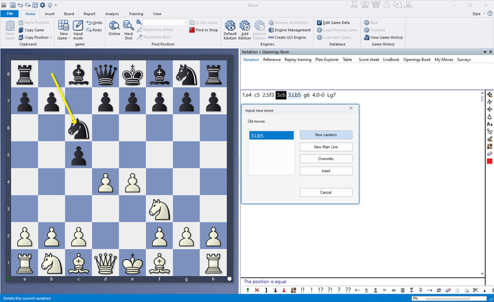 This command is used to replace a move in the middle of a line. All the other moves are retained – provided they are still legal. In our example, after 3.d4, the next black move 3...g6 would be playable, but not the following white castling, so it is deleted.