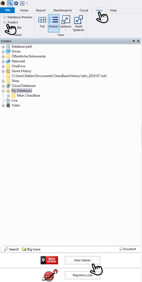 Important note: The message “Mega Update – New Games” (lower pointing finger) is only visible if the checkbox next to “Folders” at the top left is enabled (under the “View” menu).