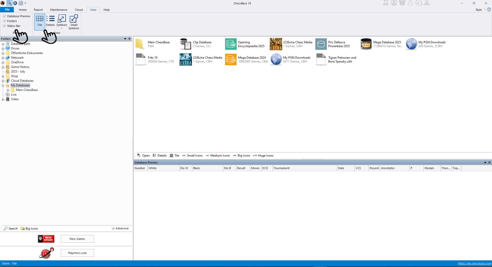 The first hand in the screenshot above — which shows the View menu already open — points to the three options that are currently checked. As a result, the large window in the lower right displays the direct list, meaning it shows the games from the database selected in the window above (in this case, Powerbase Pirc Defence).