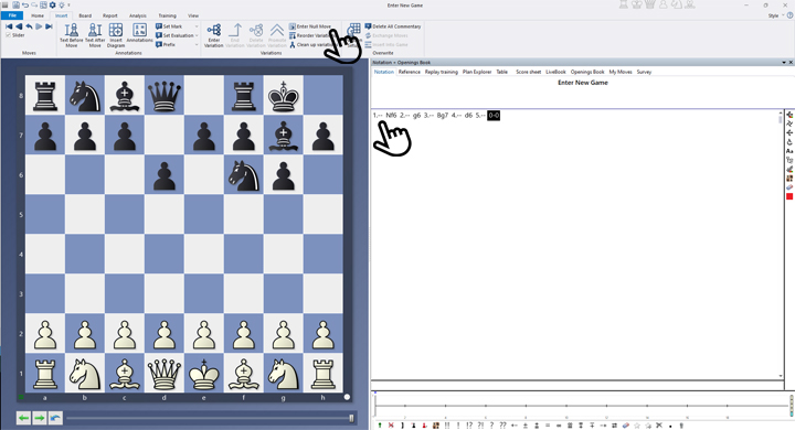 To reach this position and notation, simply start from the initial setup and click on "Null Move" (or use the shortcut ALT+CTRL+0), then enter 1...Nf6, click "Null Move" again, and enter 2...g6, and so on. On the board, you’ll see only the typical King’s Indian setup for Black, and the notation will display "--" for each null move.