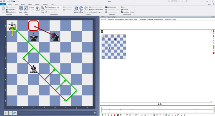Of course, the null move can also be used in combination with other analysis tools in ChessBase 18, and it’s useful in endgame training as well. Take, for example, the non-trivial checkmate with bishop and knight. One common challenge is finding the precise tempo move to avoid stalemate.