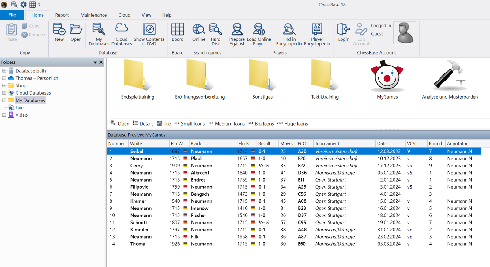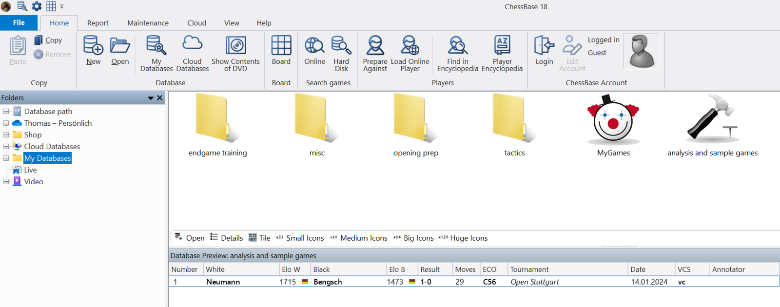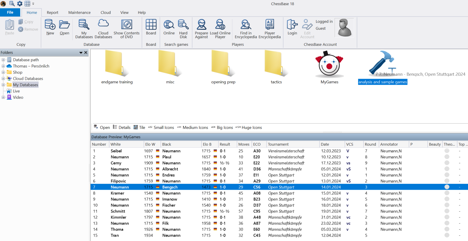 ChessBase's option of saving several games in a database is helpful here. We will show you an example of this called ‘MyGames’, which you can use as it is or customise to your own taste. However you implement it, it is essential that you understand the processes. This is because it would work exactly the same way with your games from the team season or your last club tournament or any other collection of games.
