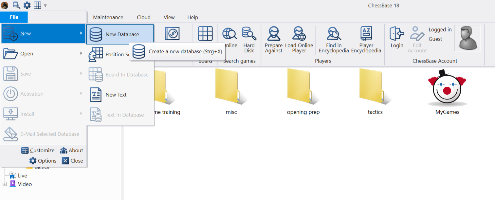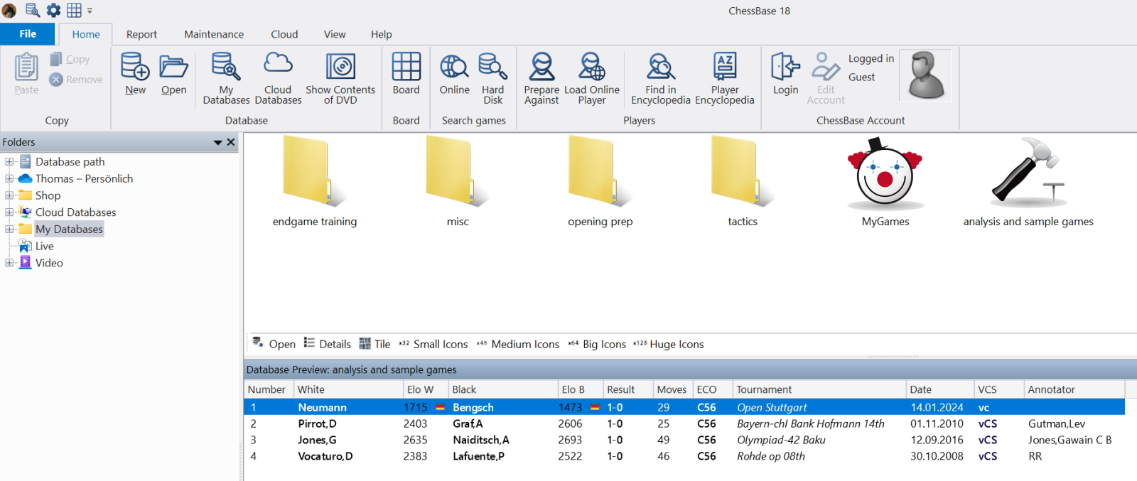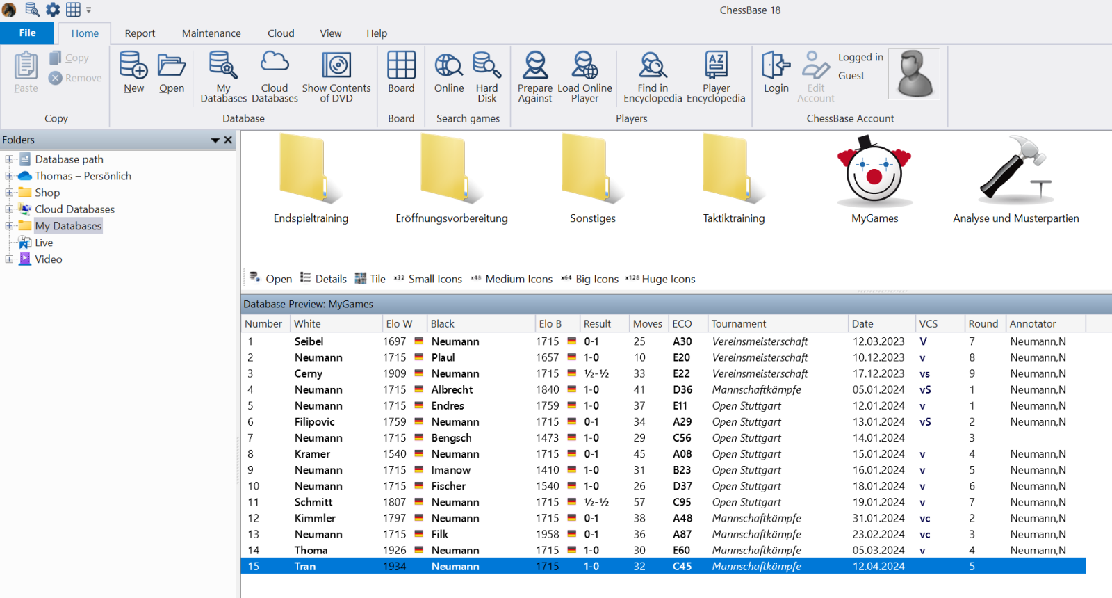 ChessBase's option of saving several games in a database is helpful here. We will show you an example of this called ‘MyGames’, which you can use as it is or customise to your own taste. However you implement it, it is essential that you understand the processes. This is because it would work exactly the same way with your games from the team season or your last club tournament or any other collection of games.