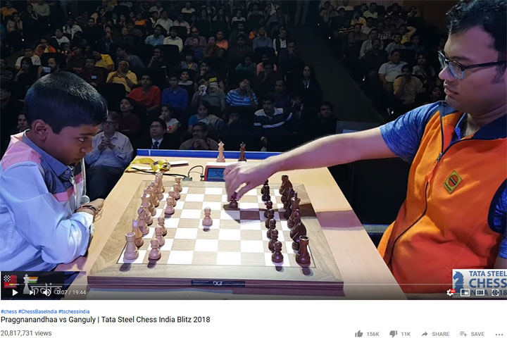 4/30/2019 – Which is the most popular chess video on the Internet? How many people watched the record-breaking YouTube video? And who is the star of the show? Magnus Carlsen? Garry Kasparov? Neither. It is a 13-year-old boy named Praggnanandhaa Rameshbabu. Really! A single video of him beating a 2650 GM in blitz chess was watched by close to 21 million viewers — chalking up 82 million watch minutes. And that's not all: other games by Pragg have been watched many millions of times as well.