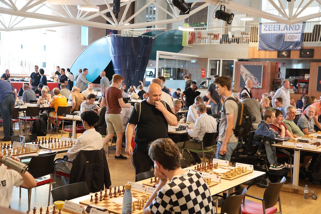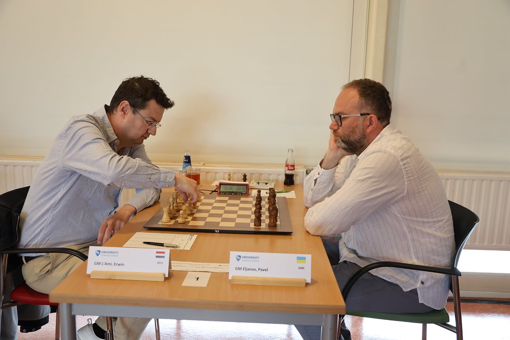 The final round was played on the morning of Saturday, 9 August, starting at 11:30. Due to a large city festival taking place that day in the heart of Vlissingen, with numerous road closures in the city centre, GM Erwin L'Ami's journey from his hotel to the university (around 3 km in a straight line) was delayed. After informing the tournament director in advance, he arrived at the top board against GM Thomas Beerdsen with a delay of 10 minutes. Playing black, GM L'Ami accepted his opponent's draw offer after nine moves – following a well-known Spanish drawing variation – and likely hoped for a favourable tiebreak. On the neighbouring board, GM Eljanov sensed his chance, facing the young German FM Schuricht in what seemed a relatively easy pairing, and eventually won despite being exchange down, thanks to a decisive passed pawn in the centre.