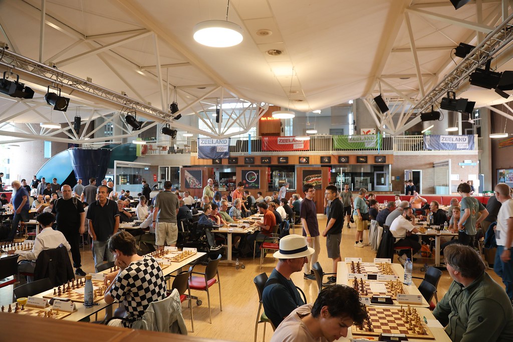 Shortly after 18:00, a number of welcome speeches were delivered, including one by tournament director Hans Groffen, a long-standing member of the organising team. The mayor of Vlissingen also offered a few kind words before the chief arbiter, IA Bart De Vogelaere, addressed the 243 participants on the tournament regulations. The event began promptly at 18:30, with the ceremonial first move made by the mayor on Eljanov's board.