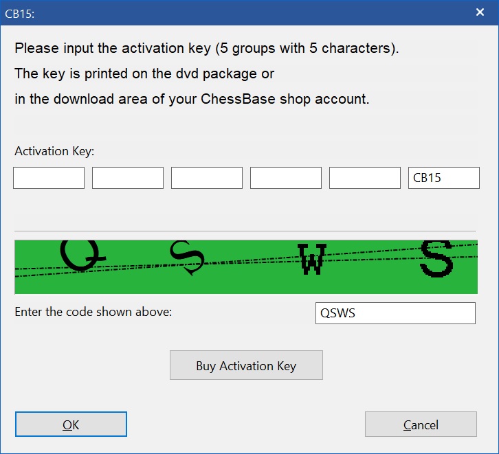 Here you enter the 25-digit code that comes with your purchase of ChessBase 15