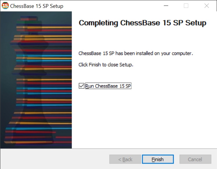 Tick the box next to “Run ChessBase 15 SP” if you would like to open ChessBase 15 automatically (just click your mouse cursor in the square box). And congratulations – you are done!