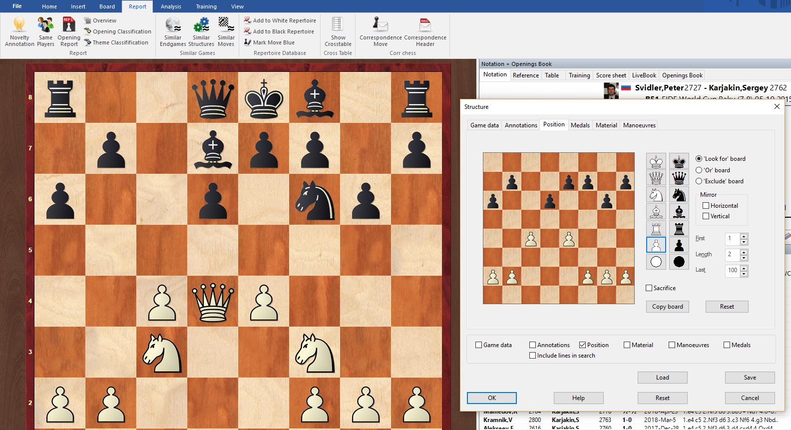 Another cool feature under report is similar structures. Choose a position and it will show how many games have been played similarly to the structure on the board. By studying these games we can see the different ways strong players have handled similar positions.