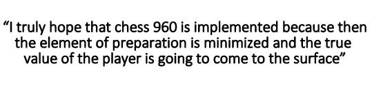 IS: I hope that chess 960 becomes popular. I would love to play chess 960. But what I would love to happen and what will actually happen are two different things. I truly hope that chess 960 is implemented because then the element of preparation is minimized and the true value of the player is going to come to the surface.