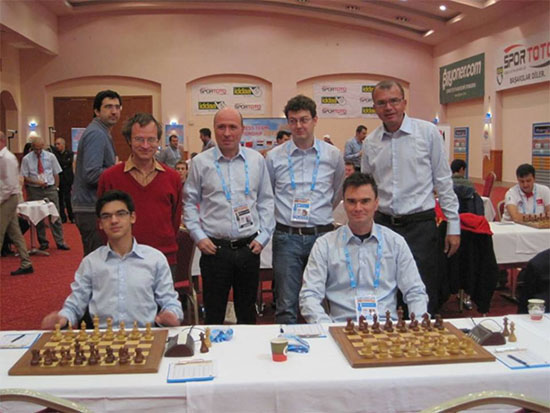 The Dutch team at the World Team Championships, 2013 consisted of Anish Giri, Sergey Tiviakov, Vladimir Kramnik?!!, coach Vladimir Chuchelov, Erwin L’Ami, Loek Van Wely and Ivan Sokolov (picture by Tiviakov)