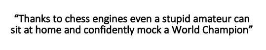 I lived through Karpov-Kasparov matches, I remember analyses room, Tal usually leading the analyses and I also remember that when some games were finished we would all sit and analyse for hours and then think why didn’t Karpov or Kasparov play this move and we would say, hang on, there should be something because such a genius would not miss it. Sometimes we were right, sometimes not. But now thanks to chess engines this is lost. So I don’t like engines. Chess World Champions were heavily promoting it with all these computer matches in order to make money for themselves, not stories like we want artificial intelligence in the sport which Kasparov was coming up when he played a match against IBM. He wanted to make money. There was nothing else. And then coming up with stories like he got cheated is a complete crap.
