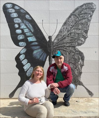 Diana and Vasyl in front of the mural Biomechanical Butterfly in Djerbahood, the island’s open-air museum.