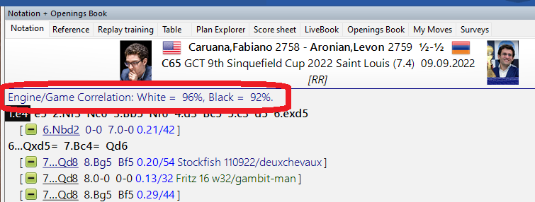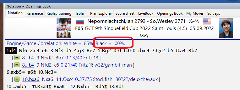 10/17/2022 – There are several ways to check a player's performance using an engine. One is to simply ask an engine to analyze every move and highlight every disagreement however small. Another is to use the tool in ChessBase and Fritz known as Let's Check. Here are the results from the recent Sinquefield Cup including a 100% match and the curiously high results by...