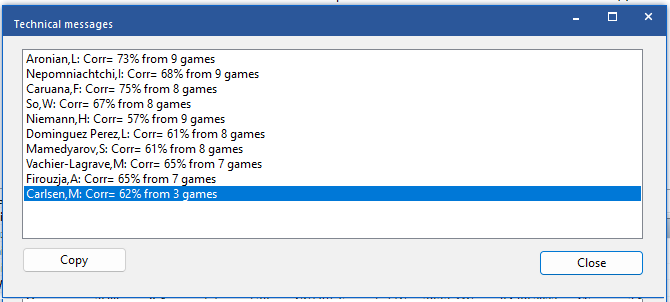 The first result to come out was that one player did actually obtain a 100% match. This was not the result of some ultra-short draw, since Let's Check will ignore theory moves, and games with too few moves played. I.e. a game that was 28 moves long but had 20 moves of theory will not be eligible for an Engine Correlation result. Who is this engine matching wonder? Wesley So.