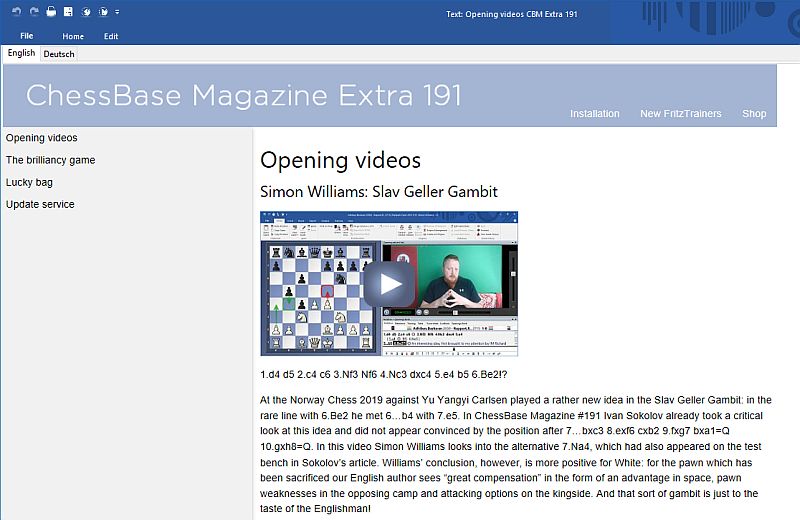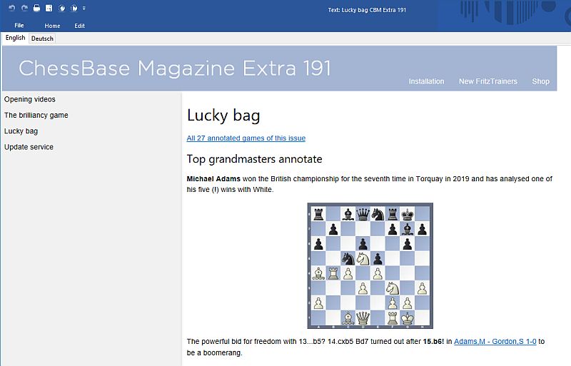 In the "Lucky bag" you'll find analyses by top players like Adams, McShane, Vidit, Adhiban, Firouzja and many more. Videos by Simon Williams, Yannick Pelletier and others. Plus over 44,000 new games for your database!