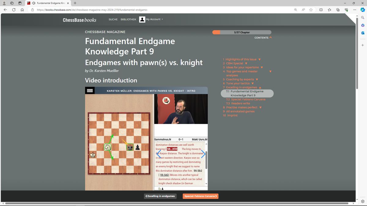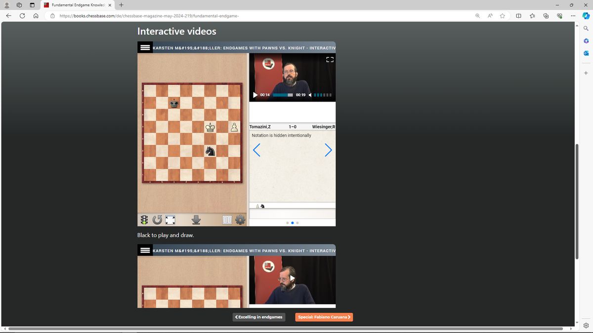 "Knight check shadow", "Karpov distance" and much more. Karsten Mueller continues his training series. Following an introductory video, your technique is in demand in two interactive videos! Mueller also provides a contribution with the most beautiful endgames by Fabiano Caruana (video introduction + analyses).