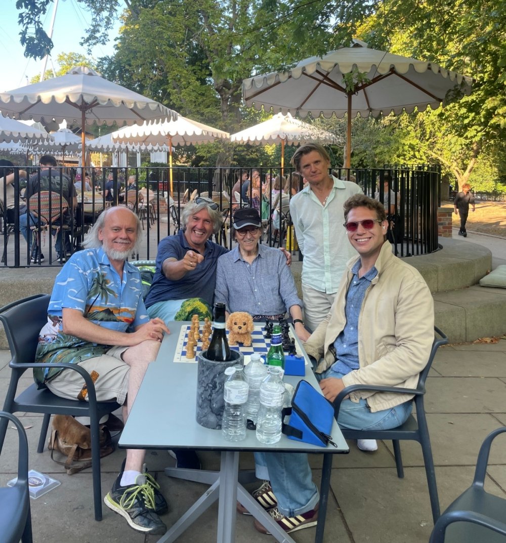 Jason Kouchak and Don Black playing chess with friends - left: GM Stuart Conquest