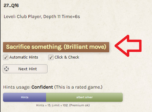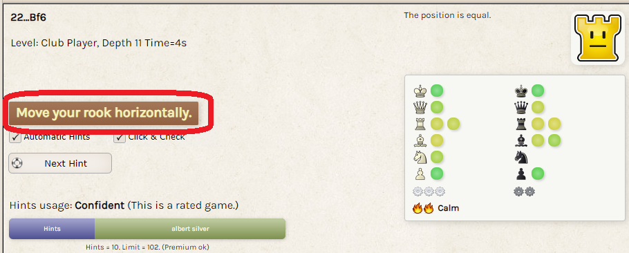 On the other hand, aside from direct hints, there is also another way to ask for a clue: long-pressing the piece you are considering. Suppose in this position I am considering moving the bishop.