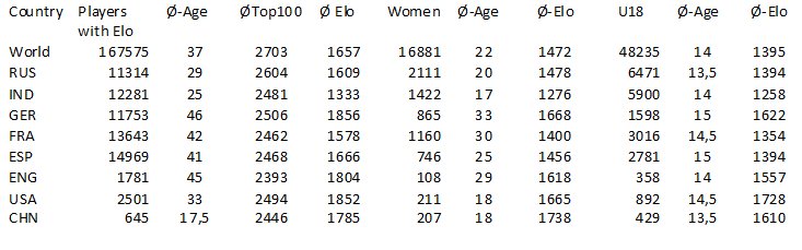 In January 2019 India had 82,000 AICF-registered players, 40,514 of them were juniors. In Russia, too, more than half of the active players with an Elo rating are juniors. As far as tournament chess is concerned the USA and China seem to move a bit outside of the Elo system. The US Chess Federation (USCF) has 90,000 members but only 2,500 active players with an Elo rating. England also has a surprisingly low number of players with an Elo rating. Germany has the most active seniors (60+): 3229 seniors have an Elo rating and are active! Together with the inactive players Germany has 25,160 players with an Elo rating, and the average Elo rating of these players is 1882, almost a 100 points more than the average level of the "DWZ" of these players — the "Deutsche Wertungszahl", the national rating of Germany. Spain is the country that has the most players with an Elo rating. However, if you also take the inactive players into account Russia is clear first: 32,730 players in Russia have an Elo rating, and a lot of them are juniors.