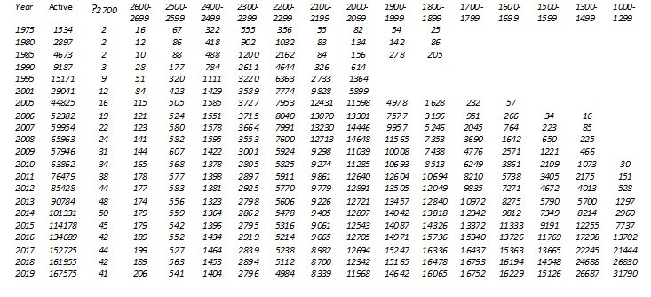 The number of active players who have an Elo rating between 2000 and 2400 also goes down. This is due to the fact that a lot of players in this rating range are listed as inactive and do not appear on this list. All in all about 160,000 players were listed as inactive in 2019, and about 60,000 of these players have not played a rated game in the last five years. In fact, a lot of these players have an Elo rating that has not changed for 10 or 20 years. Many of these inactive players have an Elo rating of more than 2000 because that was the rating-floor when these players were active. But the crucial question is: why do younger players not make up for this lower number of players with a rating between 2000 and 2400 though the total number of active players with an Elo rating has tripled during the last ten years?