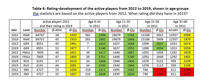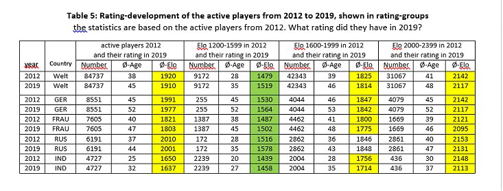 In the next two tables the players who have been leaving or entering the rating-pool since February 2012 are not shown in the statistics. Tables 5 and 6 only include those active players from January 2012 who still can be found in the 2019 players list. Whether these players are active or inactive in 2019 is irrelevant. But it is important to understand that the players shown in 2012 in tables 5 and 6 are the same players as in 2019.