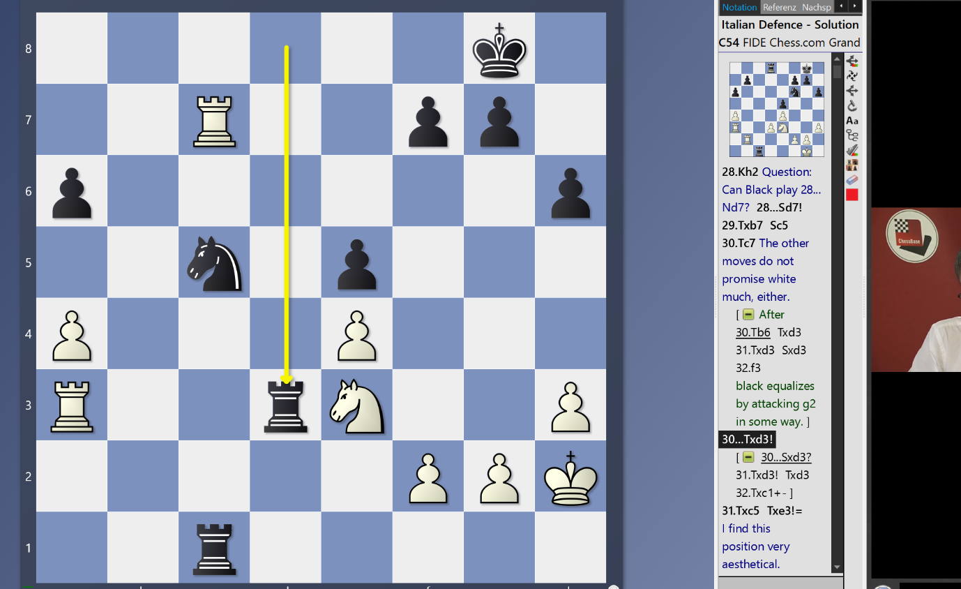 This is where the concept comes into play. Only stop calculating when there are no more capture or check moves left. Especially in longer variations, you should not be too lazy (something I know from my own experience) to go that one extra step, because it could be decisive. Just like here: 31...Rxe3! and Black gets his knight back in an aesthetically pleasing way.