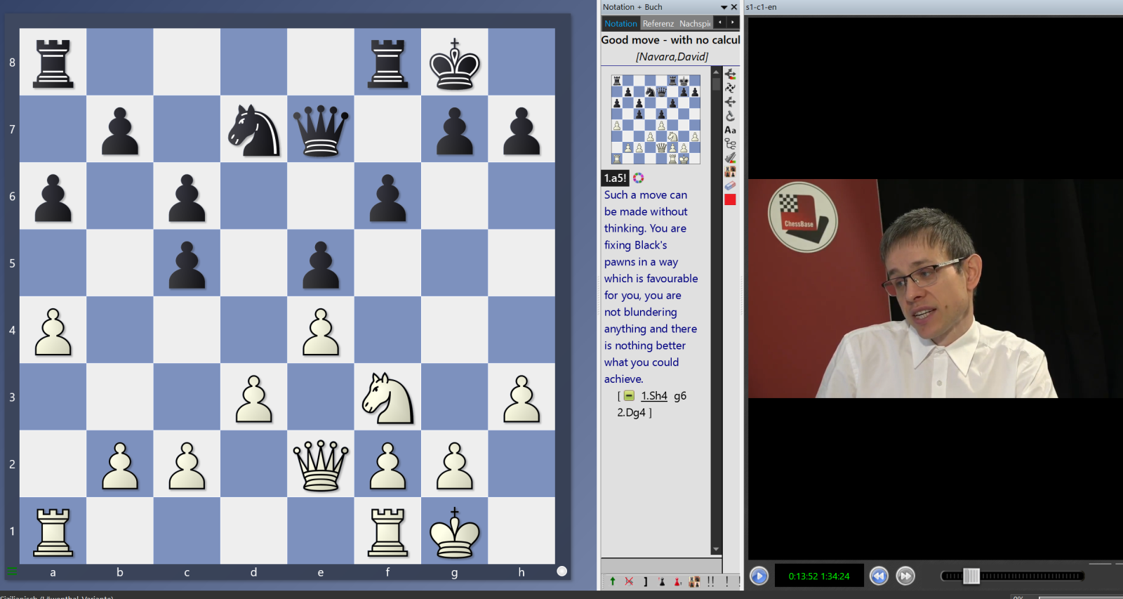 Your Calculation Compass is not a dry tactics trainer, but a compact navigation tool for everyday play. When is it worth digging deep, and when is a quick glance enough? Navara answers this question with clear criteria, vivid examples, and a healthy dose of humor. For the price of a hamburger kebab, you get almost ninety minutes of top-level coaching that you can revisit at any time. If you want to use your thinking time more wisely while also sharpening your tactical vision, this is the right choice.